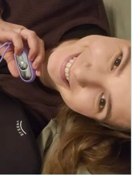 Laura Neumann, Flugbegleiterin, erzählt, dass sie Calmy™ auf Langstreckenflügen immer dabei hat, um trotz Jetlag leichter einzuschlafen.
